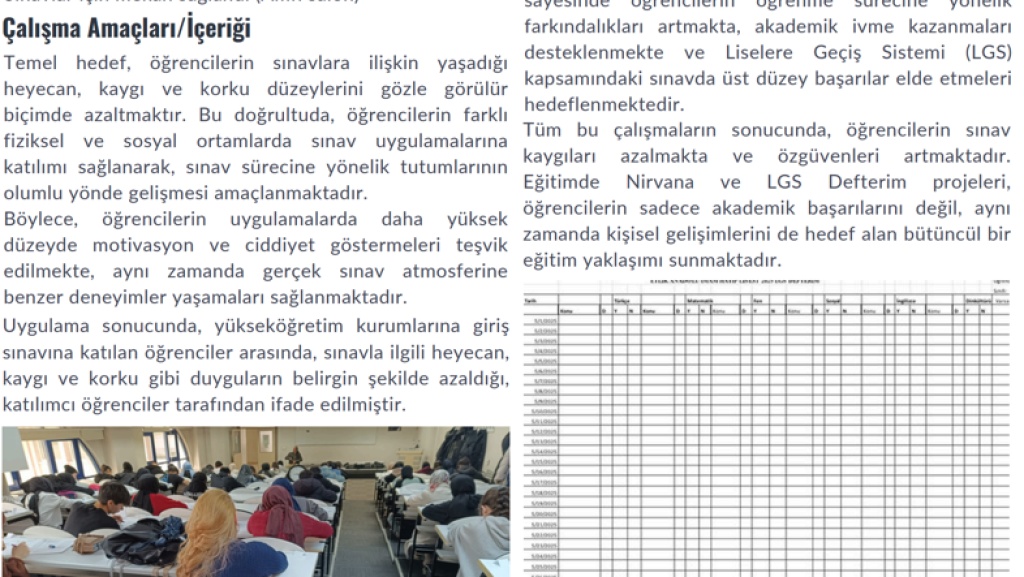 Okulumuz Rehber Öğretmeni Mahmut Birgin tarafından yürütülen "LGS Defterim" ve "Eğitimde Nirvana Projesi" çalışmalarıyla öğrencilerimizin sınav kaygısı, heyecanı ve korkusunu azaltmak hedeflenmiştir. Bu projeler kapsamında, Ankara Yıldırım Beyazıt Üniversitesi'nin amfi salonları birebir sınav uygulamaları için kullanılarak öğrencilere gerçekçi bir sınav deneyimi sunuldu.